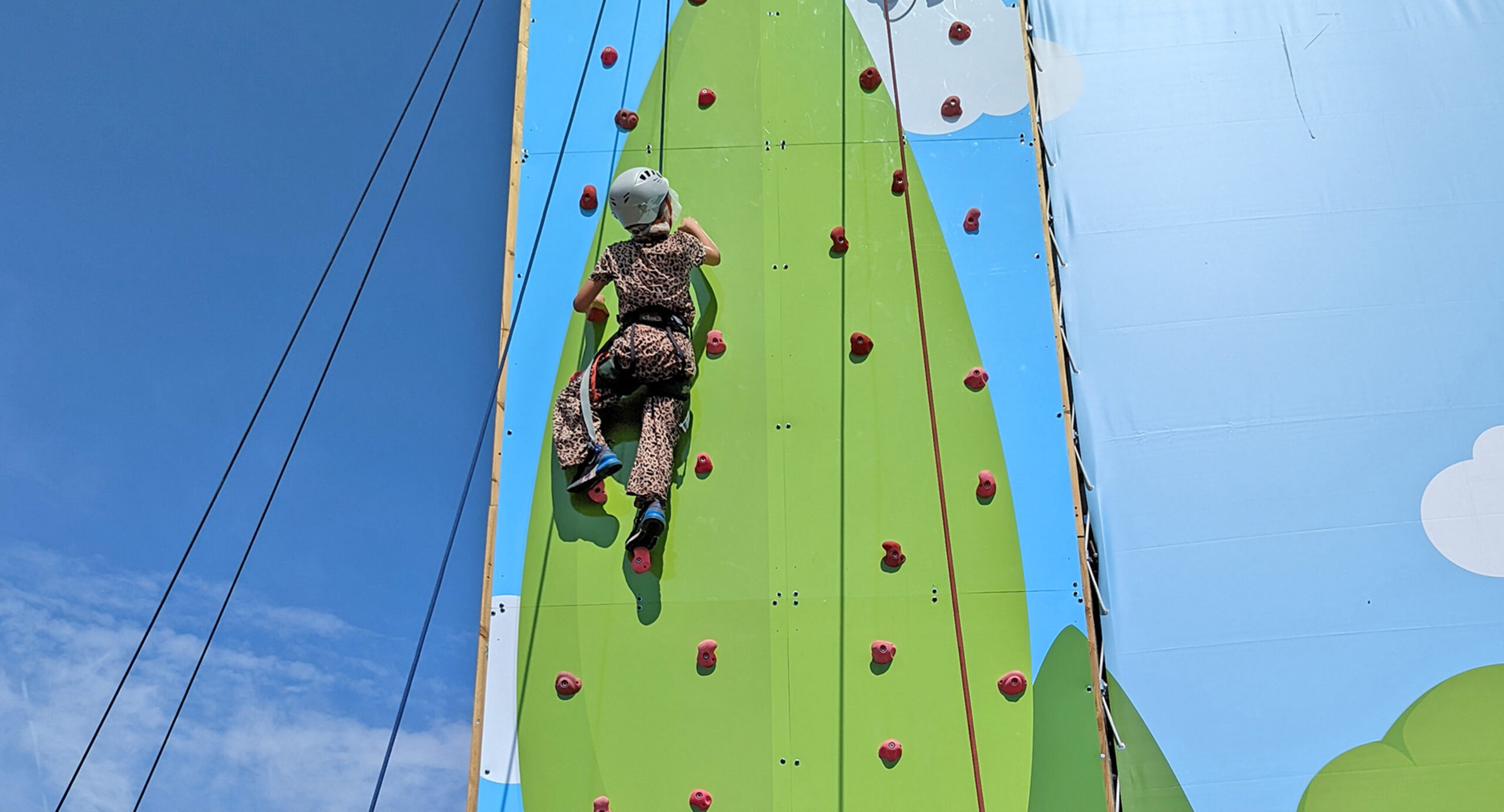 - Un mur d’escalade inhérent à la piste de luge. Cette année, celui-ci mesure 8m de hauteur et comporte 2 voies d’escalade. Son ascension permet de rejoindre la plateforme de départ de tyrolienne.
