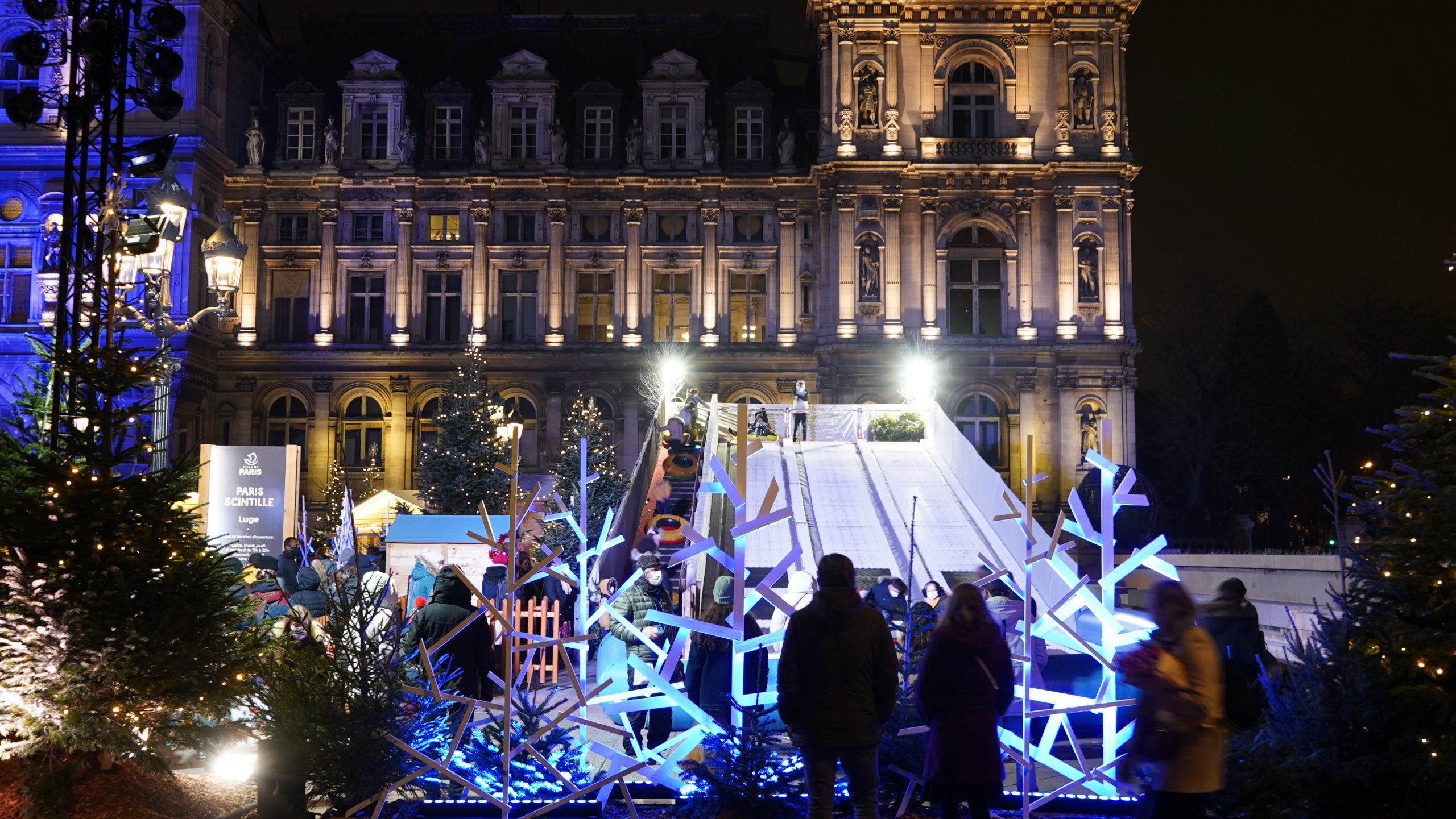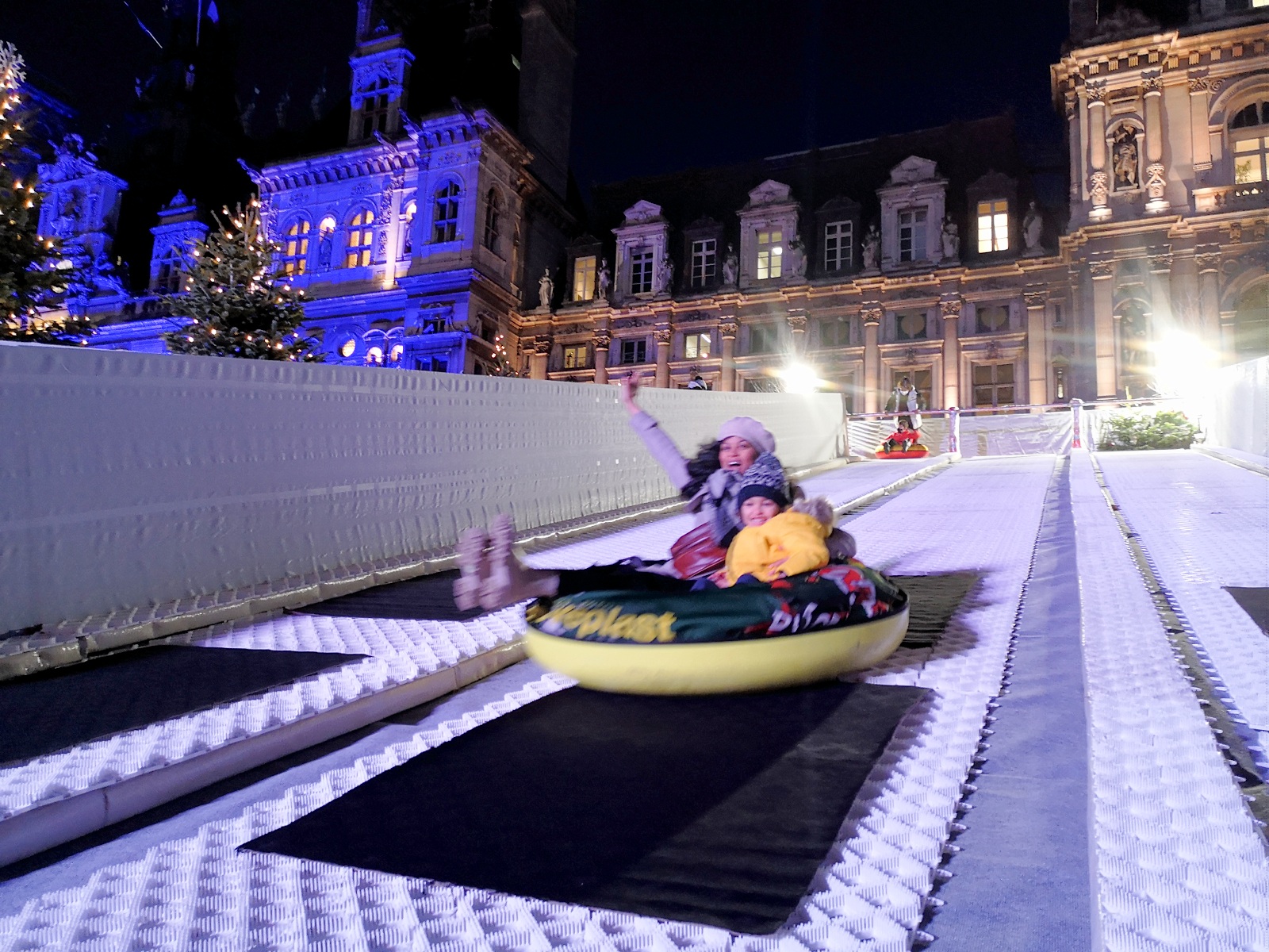 Pour l’édition 2021 de “Paris Scintille”, et dans une démarche éco-responsable, la ville fait le choix de travailler avec les équipes Gliss Event et d’installer une piste de luge synthétique surplombant son village de Noël.
